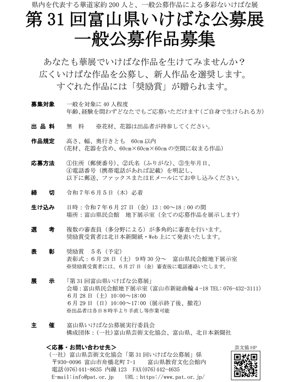 住所(郵便番号)、氏名(ふりがな)、生年月日、電話番号(携帯電話があれば記載)を明記の上、6月5日(木)必着で富山県芸術文化協会事務局に申込(下記ボタンより、Webより申し込みできます。)